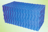 折波改进型为点滴薄膜式填料。其片型在折波填料基础上增加了数条与水平夹角呈60°的梯形斜波纹,纵向有等距离上下交替对称排列的加强筋,片距采用椭园锥形台凸台和凹槽粘结固定。和折波填料比较,提高了气水扰流,减缓了水膜下泄速度,增大了填料比表面积,延长了水、气热交换的时间,提高了填料散热性能,减少了进风阻力。