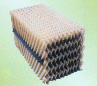 斜交错填料 1.35*15*60°斜波填料 特点: 典型的薄膜式填料,广泛用于中、小型冷却塔 比表面较大。 热力特性较佳,相应阻力较大。 II.50*20*60°斜波填料 特点: 应用广泛的薄膜式填料,一般大型冷却塔都采用此种填料。 热力性能高、阻力小。 不易堵塞。
