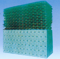 特点: 折波型的板面加强了水流和空气和扰流,其散热面积增长系数较大。板面上圆锥形突出件,既起保持片距的作用,又能使片体之间落下的水流层溅散成细小水滴,使这种填料具有点滴薄膜式性能,增加散热面积,提高冷却效果。